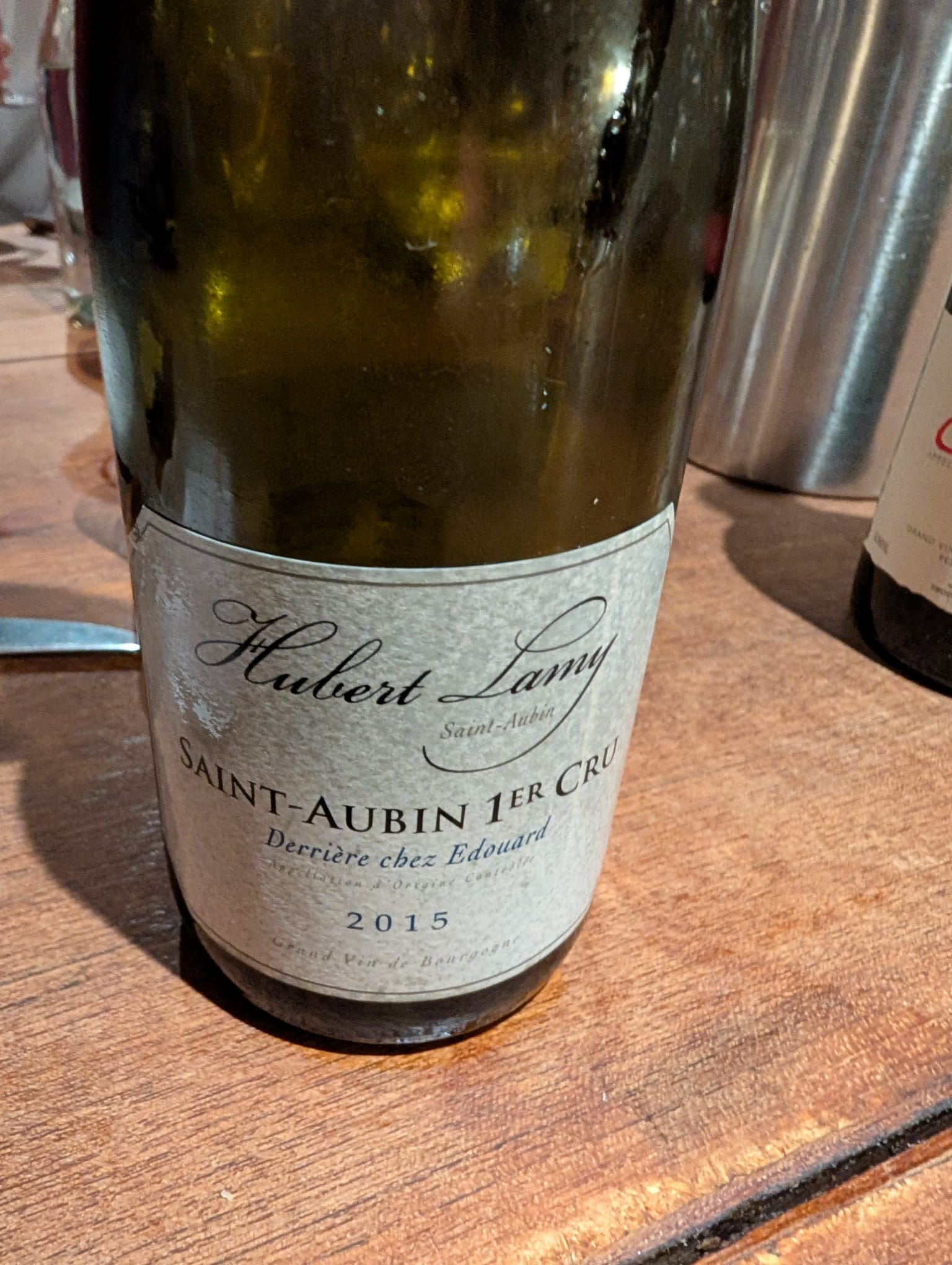 After opening with the Roederer Rosé 2012 at the Elitistreview 20th anniversary lunch, we then moved on to whites with a St Aubin 1er Cru Derriere chez Edouard 2015, Hubert Lamy – exactly half the age of my organ.