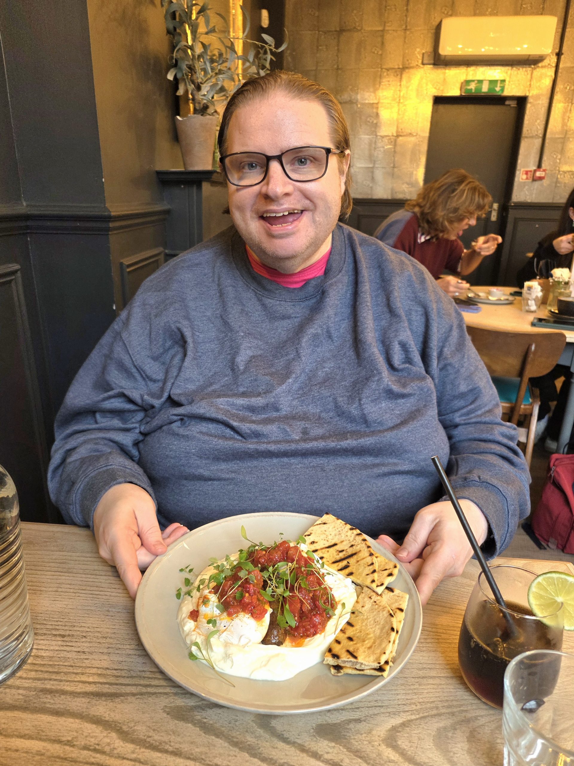 The Editor chose North African Eggs. This was poached egg with a yoghurt sauce, tomatoes and a merguez sausage. He also loved it but said the merguez could have been a bit spicier. Ignore his complaint. If there was a global thermonuclear war, The Editor would say, “That could have been a bit spicier.” It looked excellent and he was certainly very pleased with it.