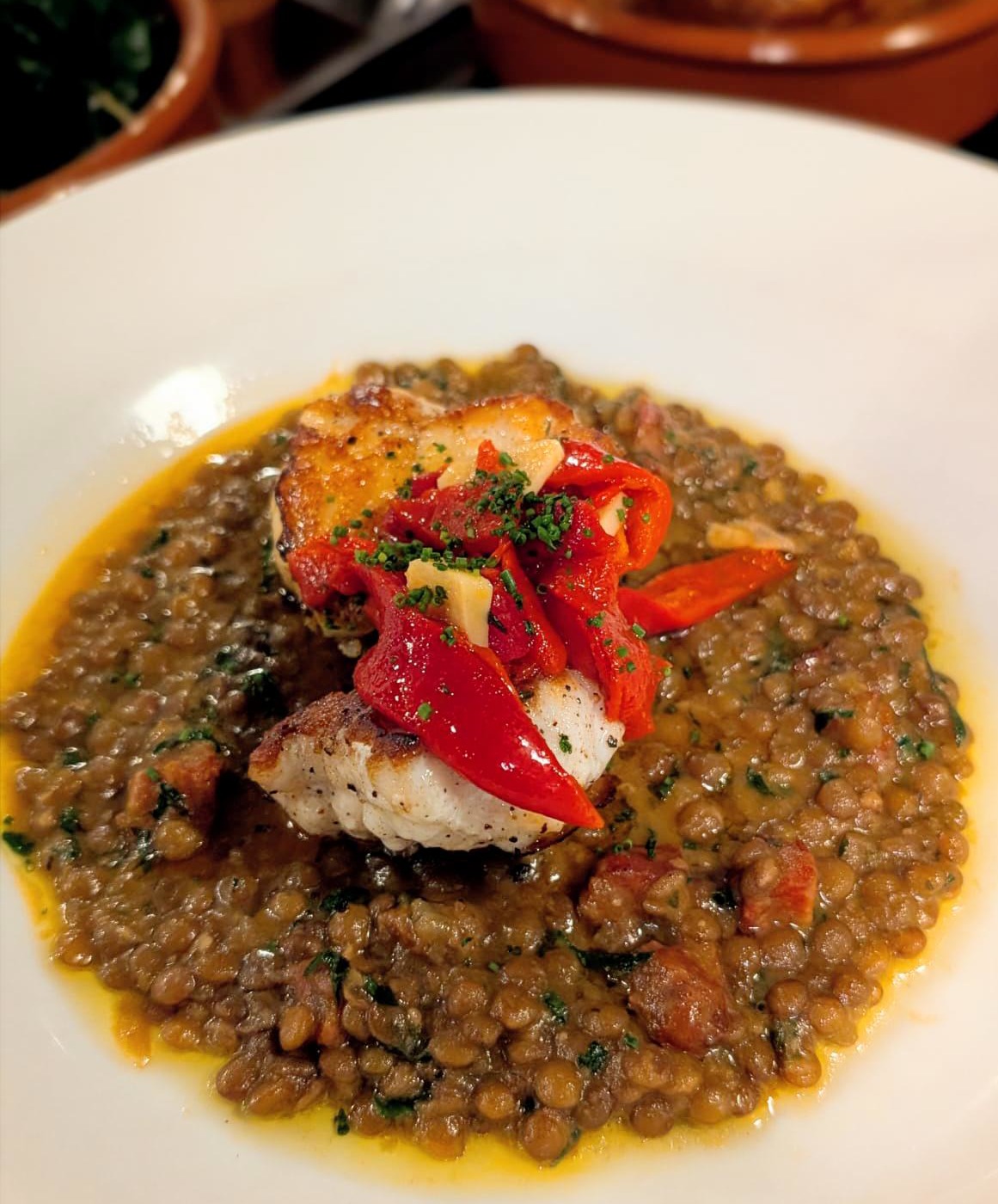 To those who insist on having white wine with fish, I say, “Pooh to you! Pooh to you with knobs on!”. Our two silken, svelte Northern Rhône wines were a delight with our fishy main courses. Monkfish with Puy lentils, chorizo and garlic.