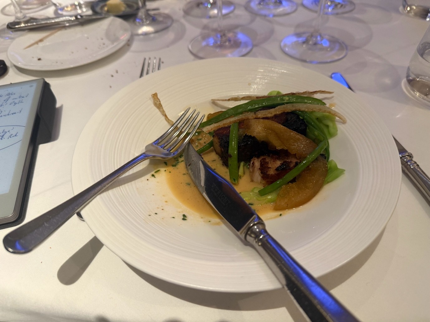 This is not what I expected, although I cannot claim to have been mis-sold. I was expecting a terrine made from crisp pork belly and black pudding. What I got was pork belly with black pudding on it. It was, again, delicious. It did not exactly match what was needed at that stage of the dinner. Coming in from a cold walk on a blustery day, however, it was hard to imagine anything better.