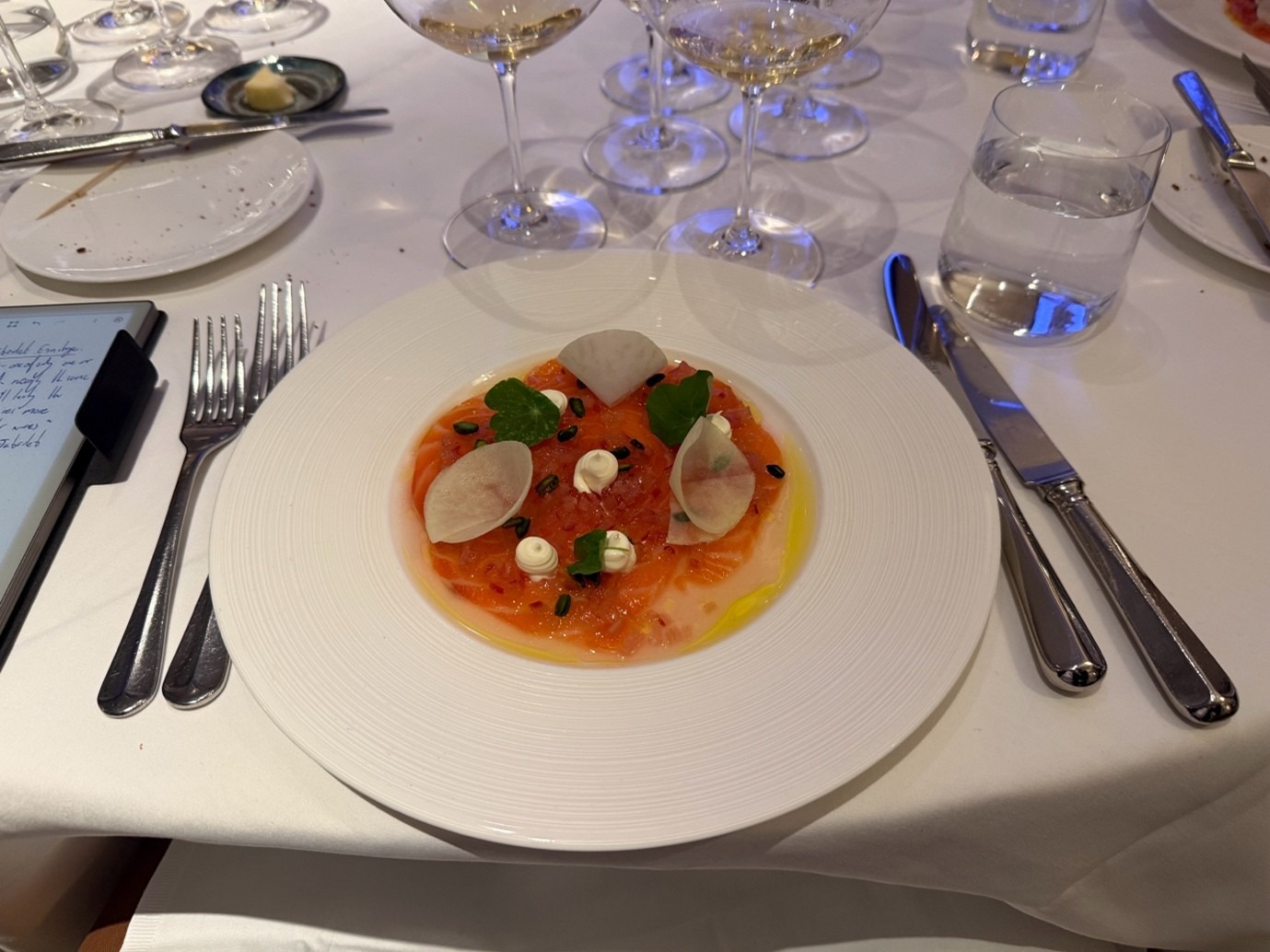 This looks like one of those light, tart ceviche dishes that have become so popular in London. It is not. It is exactly what it says it is: superb sashimi-grade salmon, with an elevated but delicate dressing that does nothing to challenge the wine and leads to a harmonious whole. Flawless.